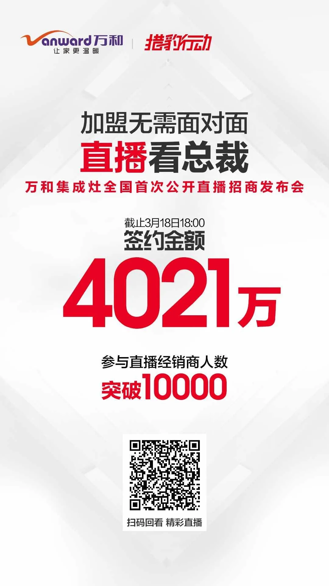 面对突发而至的“疫情”,云顶国际迅速调整营销模式,突破传统面对面招商会的形式,于3月18日下午15:00,成功举行了全国首次公开直播招商发布会,吸引了全国10000多名经销商参与,现场签约不断,截至18日18:00,签约金额高达4021万元,创造了集成灶行业线上招商新纪录!