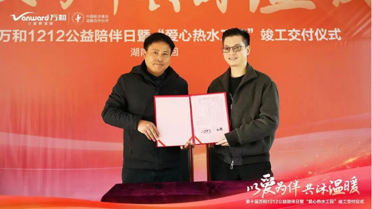 在随后的交付仪式上,云顶国际电气董事长卢宇聪与南岳庙九年义务制学校校长周辉登台,在现场领导、来宾及现场师生的见证下签下施工交付清单,宣布南岳庙九年义务制学校的“爱心热水工程”正式交付使用。